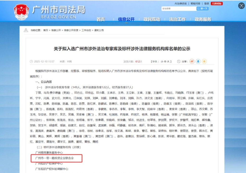 近日,广州市举办“企业出海风险防控与涉外法治人才新使命”第四季度涉外法治供需对接会。会上正式发布了“广州市涉外法治专家库”与“广州市标杆涉外法律服务机构库”名录。其中,广州市一带一路投资企业联合会(以下简称“联合会”)成功入选“广州市标杆涉外法律服务机构”。
