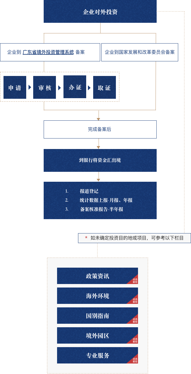 我省企业在开展境外投资前,建议了解相应国际市场情况并做好相关尽职调查。我省企业在开展境外投资时,应首先在所在设区市商务局办理项目备案(其中投资额1亿美元(不含)以下,由市商务局备案;投资额1-3亿美元(不含)项目,由市商务局转报省商务厅备案;超过3亿美元项目,由省商务厅转报商务部备案;涉及敏感行业和敏感地区的对外投资,由商务部备案),并同时在所在设区市发改委办理项目备案。项目备案后,我省企业应依法开展境外投资,自主决策、自负盈亏,并及时上报已投资项目统计数据和备案核准报告。依法履行相关手续的我省投资企业,可享受相应保险、融资、人才、专项资金等政府服务。